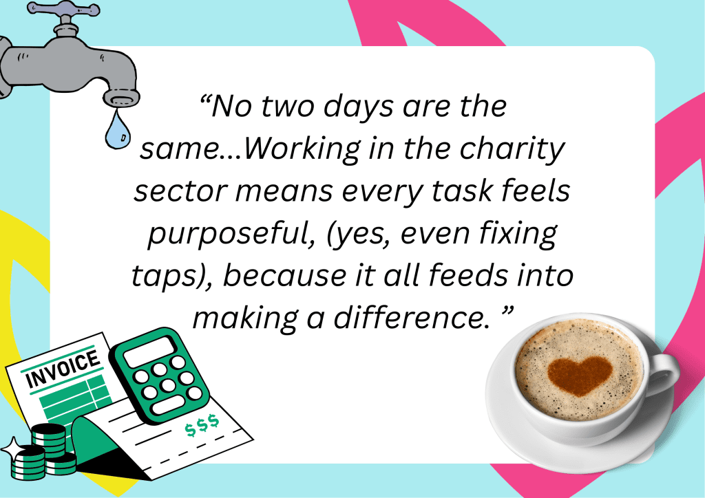 No two days are the same. I might be preparing management accounts, reviewing policies or acting as a sound board for someone who just needs a quick chat. Working in the charity sector means every task feels purposeful, (yes, even fixing taps), because it all feeds into making a difference. There’s a real satisfaction in knowing that behind every spreadsheet is impact and behind every process is a person.